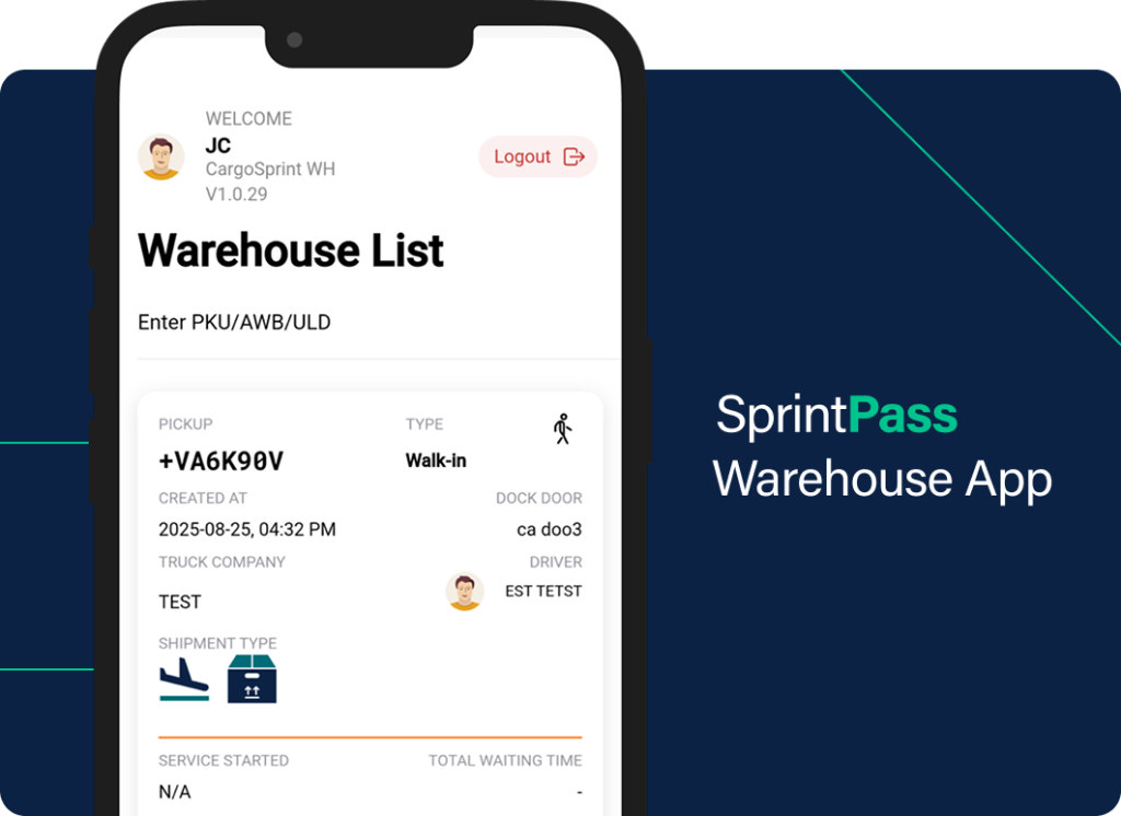SprintPass is a vehicle booking system (VBS) designed to streamline cargo operations for ground handling agents (GHA) and airlines operating cargo facilities. It optimizes and speeds up pick-up and drop-off processes at the cargo facility by connecting facility operators, trucking companies, and freight forwarders through real-time visibility and smart scheduling.